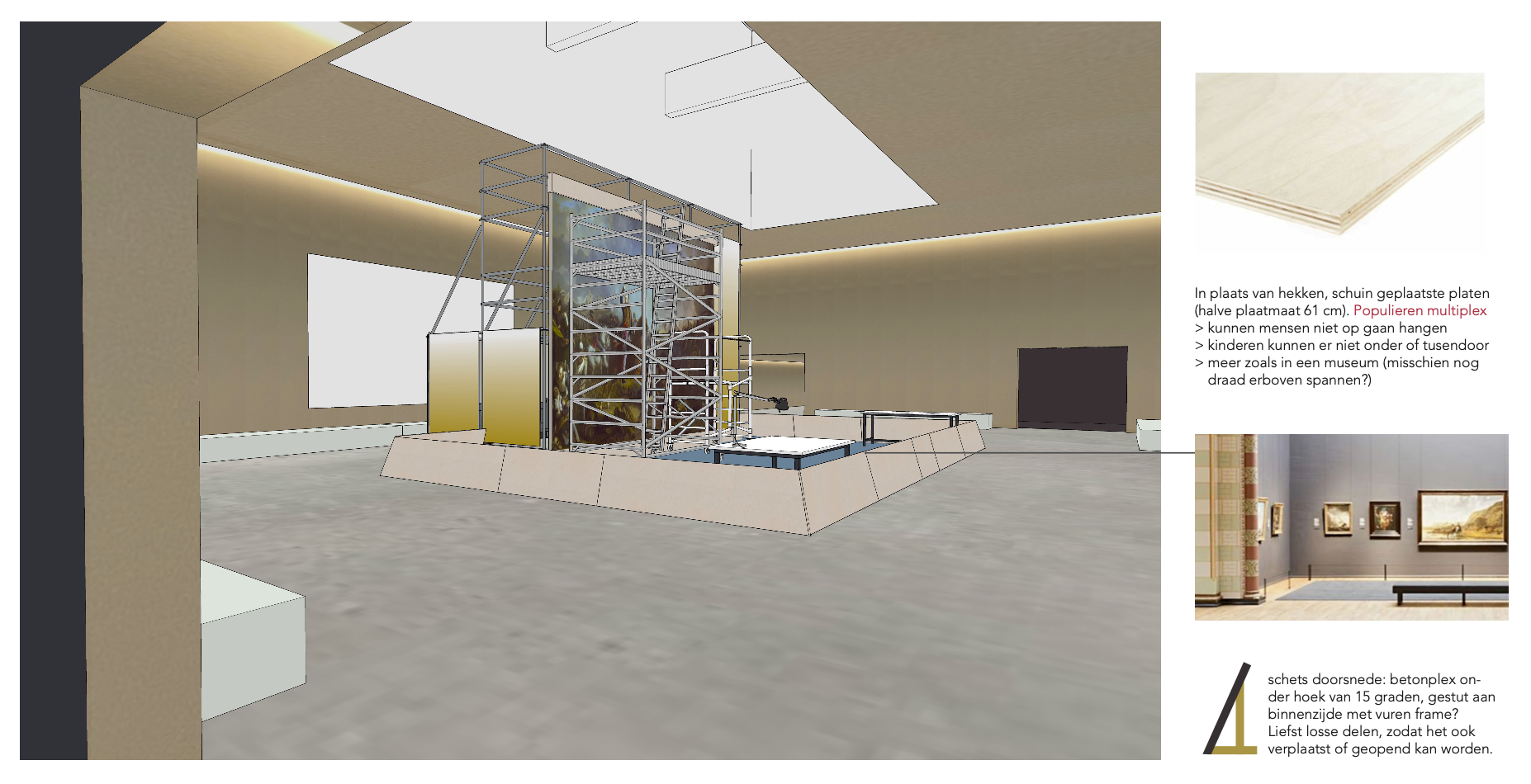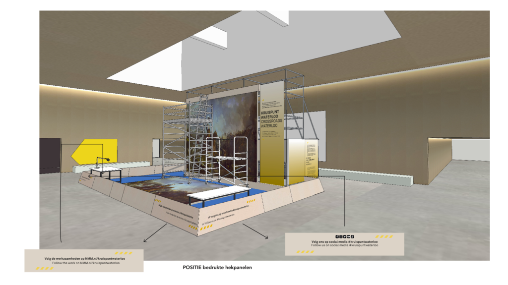 In samenwerking met tentoonstellingsmaker Eijda Vervoort heb ik een tijdelijke steigerconstructie getekend voor de werkzaamheden. Rondom deze tijdelijke constructie werd meer informatie gegeven over het schilderij en het verloop van de restauratie. Hiervoor deed ik de grafische vormgeving. Ook hebben we verplaatsbare afstandhouders ontwikkeld, die de werkplek voor de restaurateurs afbakende. De bezoeker kan wel over de schouder meekijken: een kijkje in de keuken en werk in uitvoering!