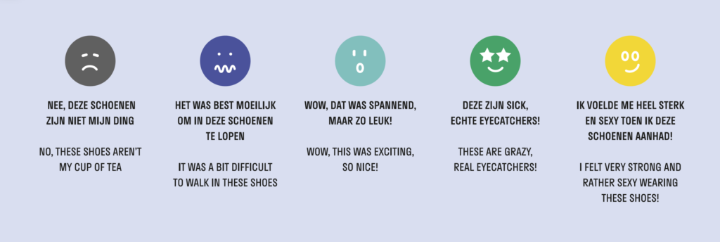 Aan het eind van de catwalk kan je dat met een emoticon-magneet ‘reviewen’ op een display met silhouetten van alle schoenen.