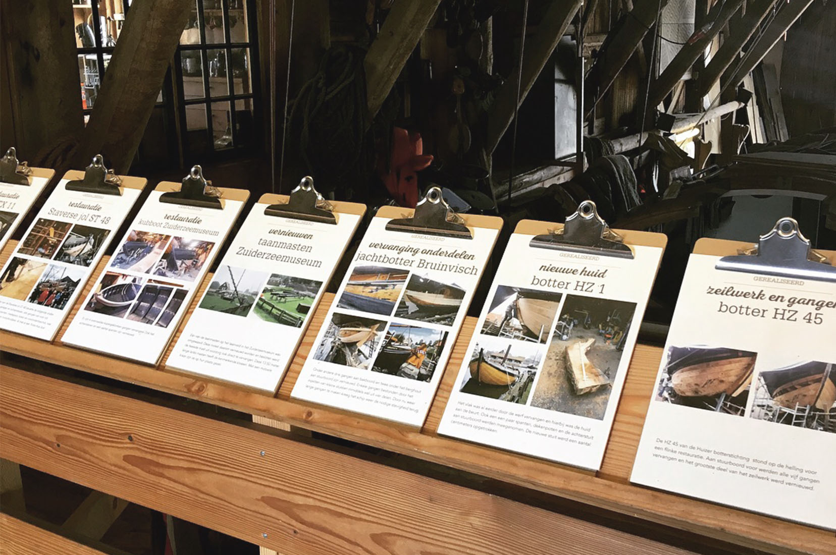 Er is uitzicht op de werkplaats en informatie over de restauratieprojecten.